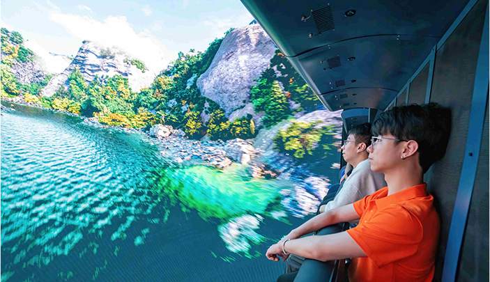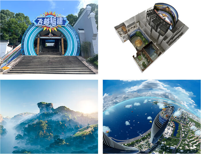 采用飞行球幕的影院形式,观众双脚腾空观影,巨大的球幕向下延伸到观众脚下,完整的视觉包裹使观众宛如置身于高空,增强体验的刺激感。 座椅结合影片情节实时动态调节,时高时低、时升时降,模拟飞行中的起伏、加速、俯冲等运动视角,在震撼音效的烘托下各种惊险刺激、震撼人心的宏大景象扑面而来。